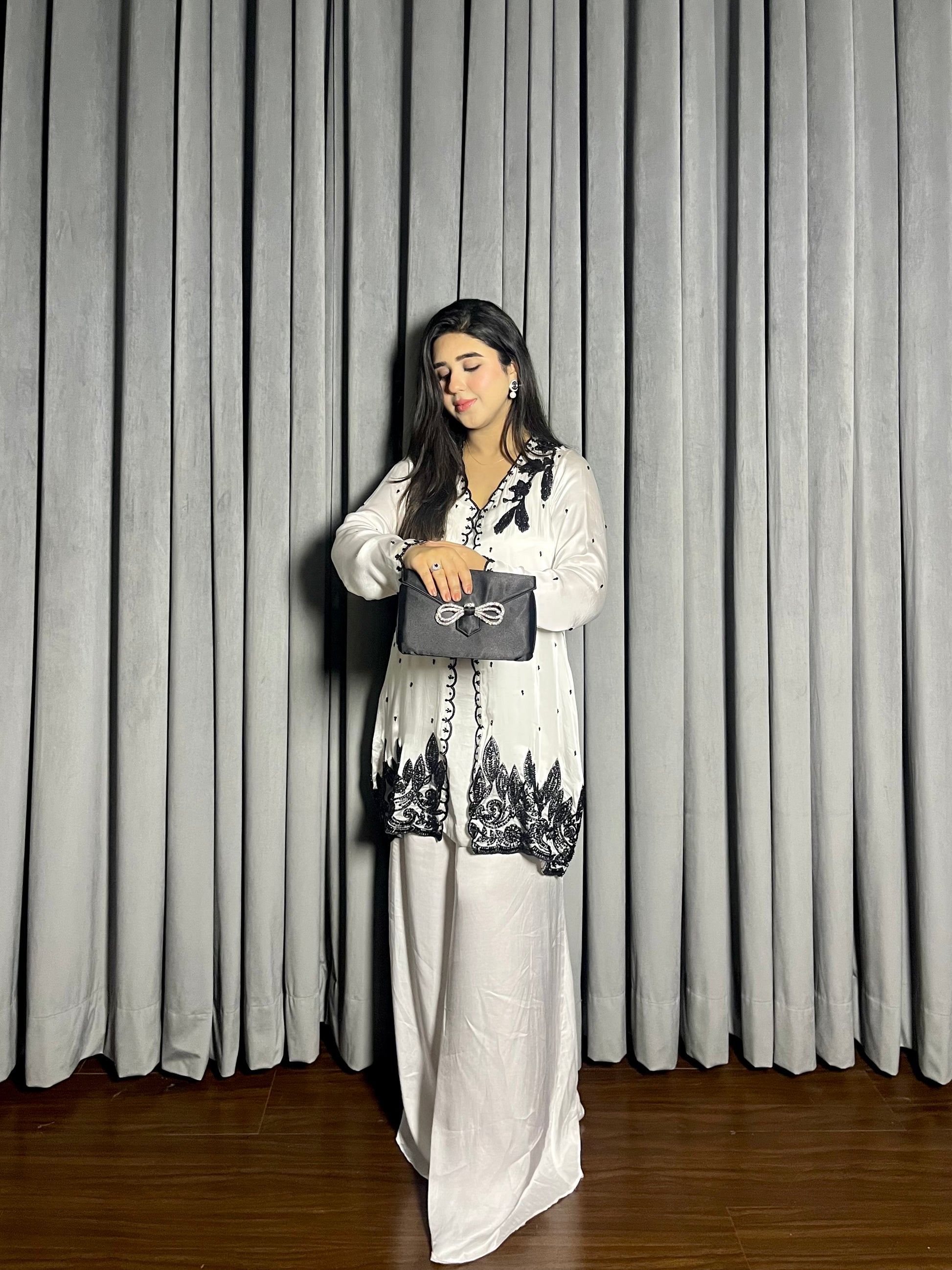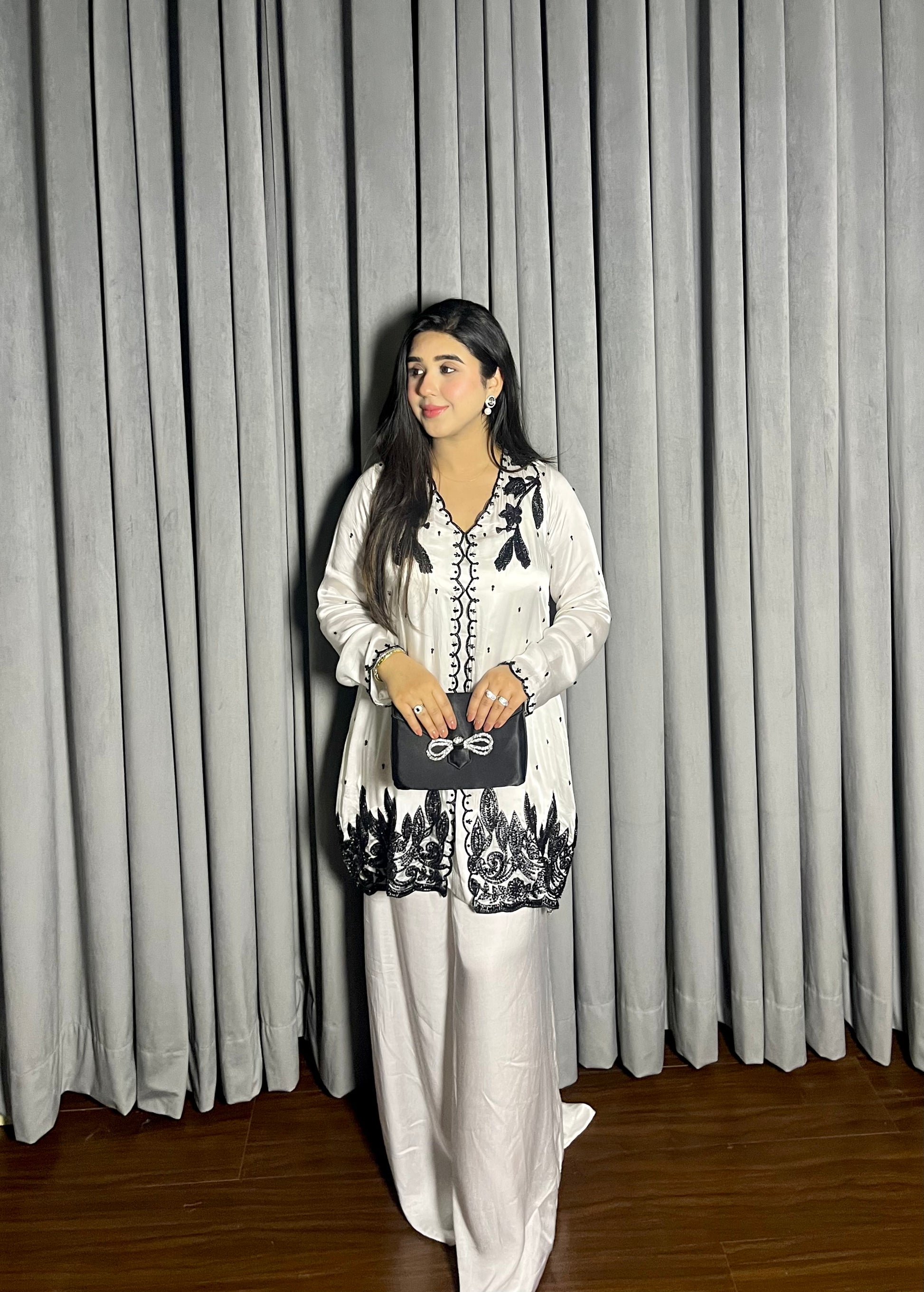 An elegant ivory silk outfit featuring a delicately hand-worked shirt paired with graceful flared pants and a smooth silk undershirt. The intricate black detailing adds contrast and sophistication, creating a timeless ensemble perfect for evening gatherings, festive occasions, and refined celebrations. 3pc