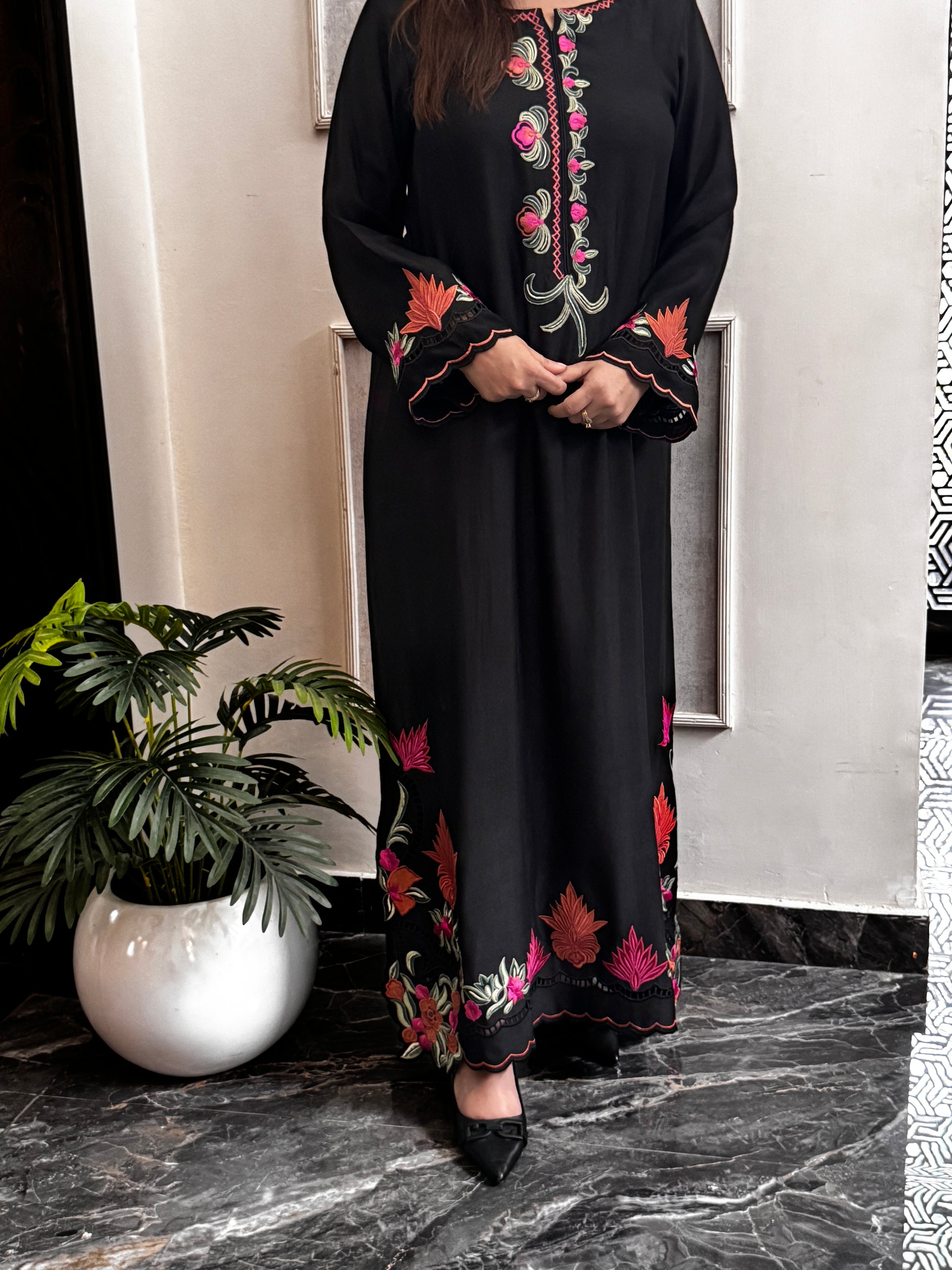 Elegance meets comfort in this black kaftan adorned with vibrant floral embroidery. Crafted in breathable fabric, its relaxed silhouette is perfect for day-to-night wear. Intricate detailing on the neckline and hem adds a luxe touch, making it a timeless addition to your wardrobe for both casual and festive occasions.
